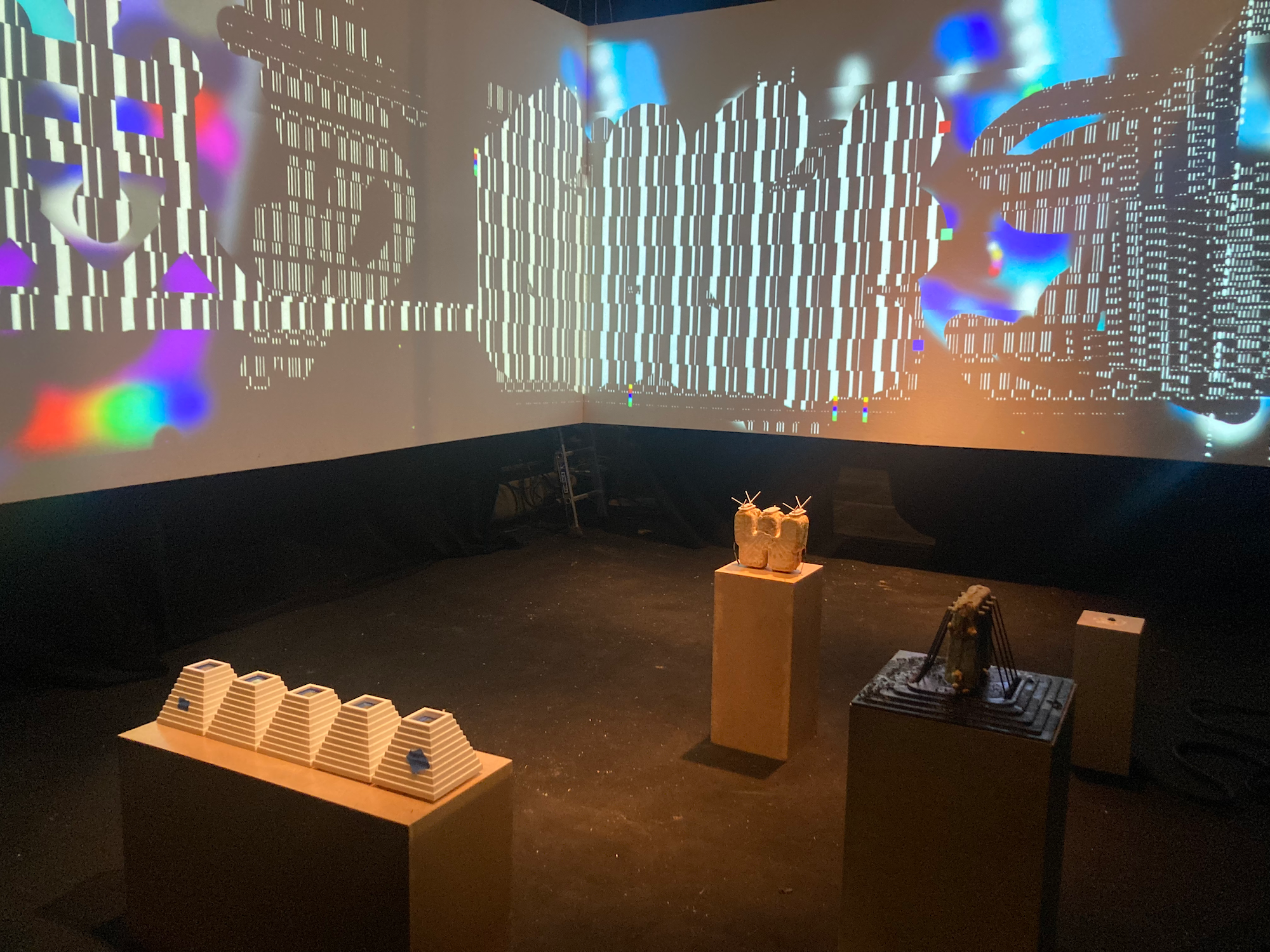 Between kinetic art, contemporary graffiti and biomaterials, the installation consists of a generative audio/video fresco and an archipelago of mini sculptures-instruments. The public is invited to interact with the image and sound through these objects, giving them life and engaging them with living programs. The visual and sound environment is generated as the instruments are explored. Diyauto Orchestra creates a playful relationship with the object: to what gesture will the sculptures respond and what event will its image produce?